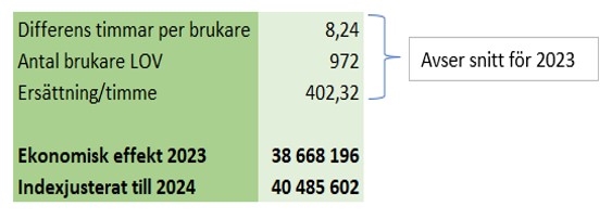 Genomsnittligt antal timmar per brukare visar vid en sammanställning att det är 8,24 fler timmar/brukare inom de samlade LOV utförarna än inom Din kommunala hemtjänst. Mätning december år 2023 visar ett ackumulerat snitt med antal brukare om 972 st. och ersättning per timme i genomsnitt 402,32 kr. (Det betyder att i snitt har personer som valt en extern utförare ca 15 minuter mer/dag, men det är tid som har beviljats av kommunens handläggare och som bedömts vara något som brukaren behöver.)