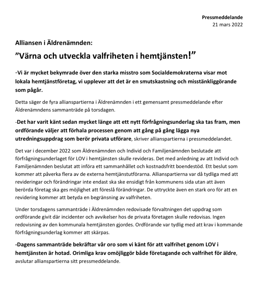 Tiden går fort och på lördag ”tappar” vi en timme när klockorna ska ställas fram. För egen del är känslan av brist på tid konstant återkommande vilket visar sig i att vissa uppgifter blivit liggande. Som att publicera nedanstående pressmeddelande som jag tillsammans med de övriga alliansledamöterna i Äldrenämnden skickade ut i torsdags efter sammanträdet. Det har gått snart en vecka, men orden är fortsatt aktuella. Det är ett misstänkliggörande och smutskastning av företag som pågår från Socialdemokraternas sida, sanningen blir sekundär när fakta utelämnas i utredningar eller intervjuer. När lögnen sedan upprepas tillräckligt ofta så är det något som görs i hoppet om att det ska tas som en sanning. En lögn som upprepas tillräckligt ofta är fortfarande en lögn.