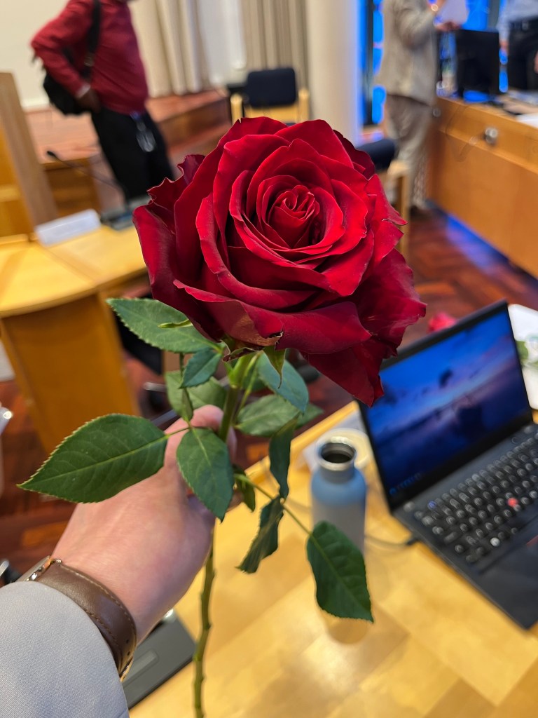 När dagen var slut fick varje partis gruppledare en röd ros av fullmäktiges ordförande. Så vacker och ståtlig. Jag gav den till vår ersättare i fullmäktige för hans tålamod att sitta med under ett möte som verkade aldrig ta slut..