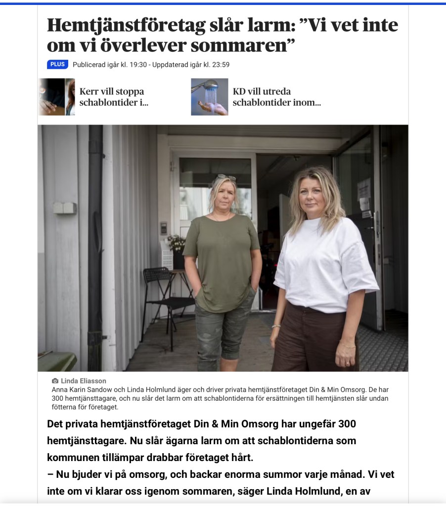 Måndagens nyhet i VK om företaget Din och Min Omsorg, en av anledningarna till mitt öppna brev tidigare, har berört mig starkt. Två kvinnliga företagare som har lagt ner hjärta och själ i sitt arbete för en god och värdig äldreomsorg riskerar nu konkurs. Det berör mig eftersom det är kommunen som har kastat om spelreglerna.