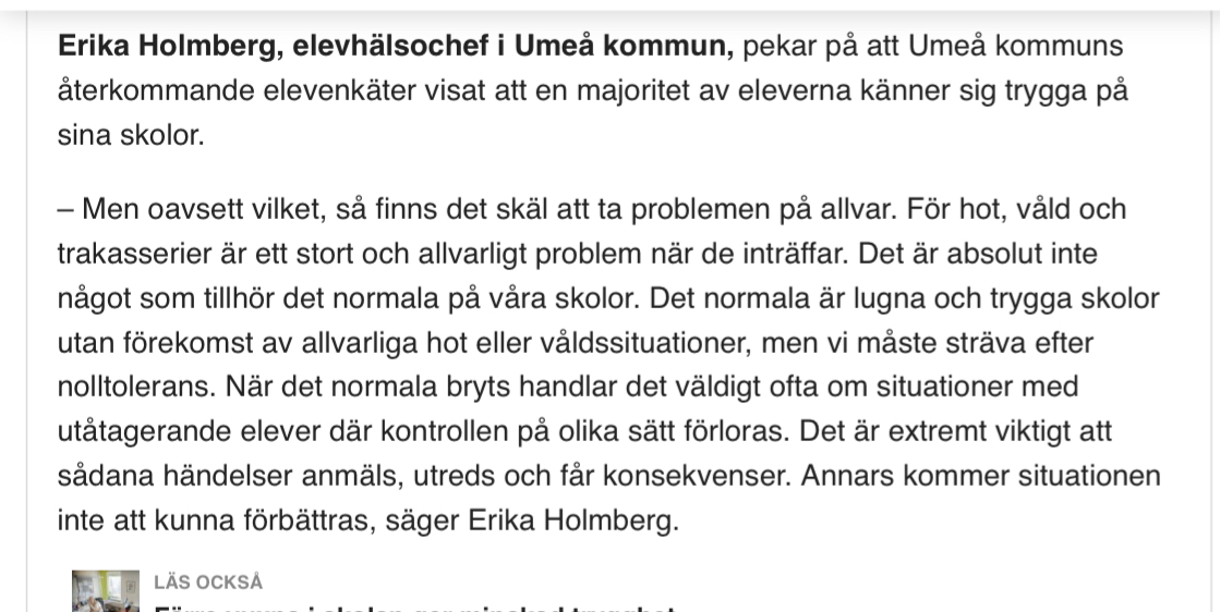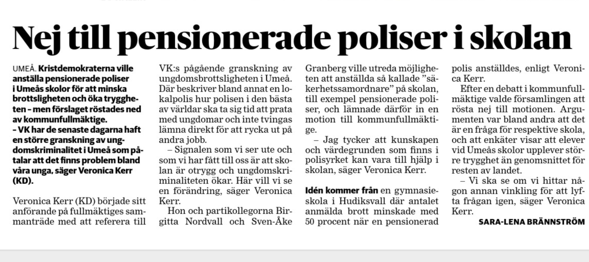 Jag är inte förvånad. Vår motion handlade inte om att ställa personalgrupper mot varandra utan att ta till vara den särskilda kompetens som pensionerade poliser har. Både när det gäller trygghetsskapande och att vara en del i värdegrundsarbete. Elever är otrygga och nu rapporterar skolorna och media. I våras fick vi svaret att barn och unga i Västerbotten är tryggare än andra, men det gäller inte alla barn. I dagens tidning uttalar sig verksamhetschefen för Elevhälsan att det finns skäl att ta problemen på allvar. Vi kristdemokrater tar frågan om trygghet för barn och elever på allvar och vi har inte släppt frågan.