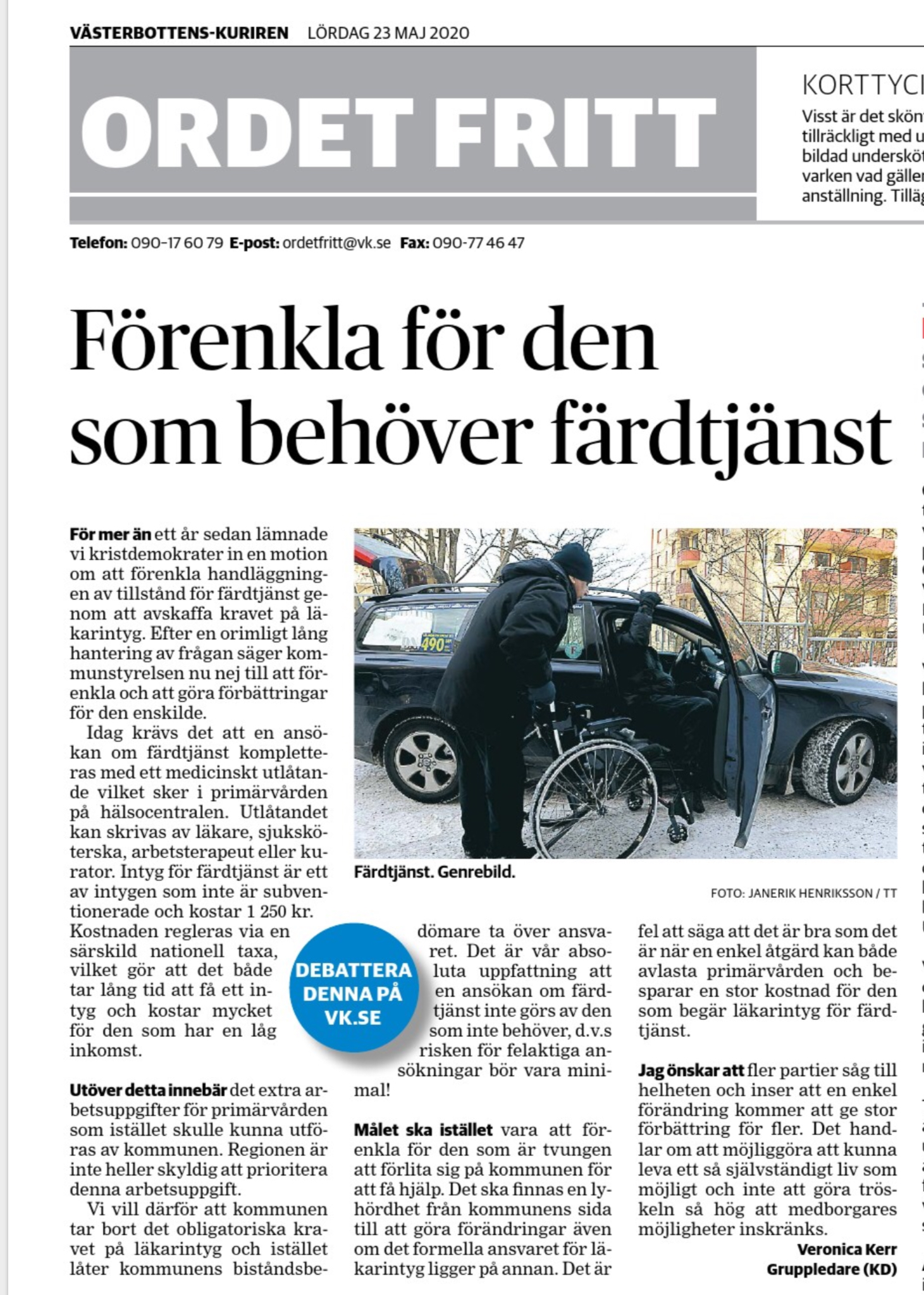 Dagordningen är också fylld av motioner, nio stycken, även där är det oklart om vi kommer att hinna med någon. För ovanlighetens skull har Kristdemokraterna två motioner på dagordningen ”Avskaffa kravet på läkarintyg för färdtjänst” och ”Anställ pensionerade poliser i skolan för ökad trygghet”. Jag hoppas att de båda får den tid och uppmärksamhet som frågorna förtjänar även om det är en risk för att det inte blir i morgon. I gårdagens VK publicerades mitt inlägg till kommande debatt om att förenkla för den som söker färdtjänst. Idag fick jag ta del av reaktioner från en läsare och en person som också besökt enheten för hemtjänst. Samtalet var fyllt av frustration över hur svårt det är när det går att förenkla. Jag uppskattar när människor tar kontakt för att dela med sig av erfarenheter. Vi kanske inte alltid har samma uppfattning, men lyssna det vill jag.