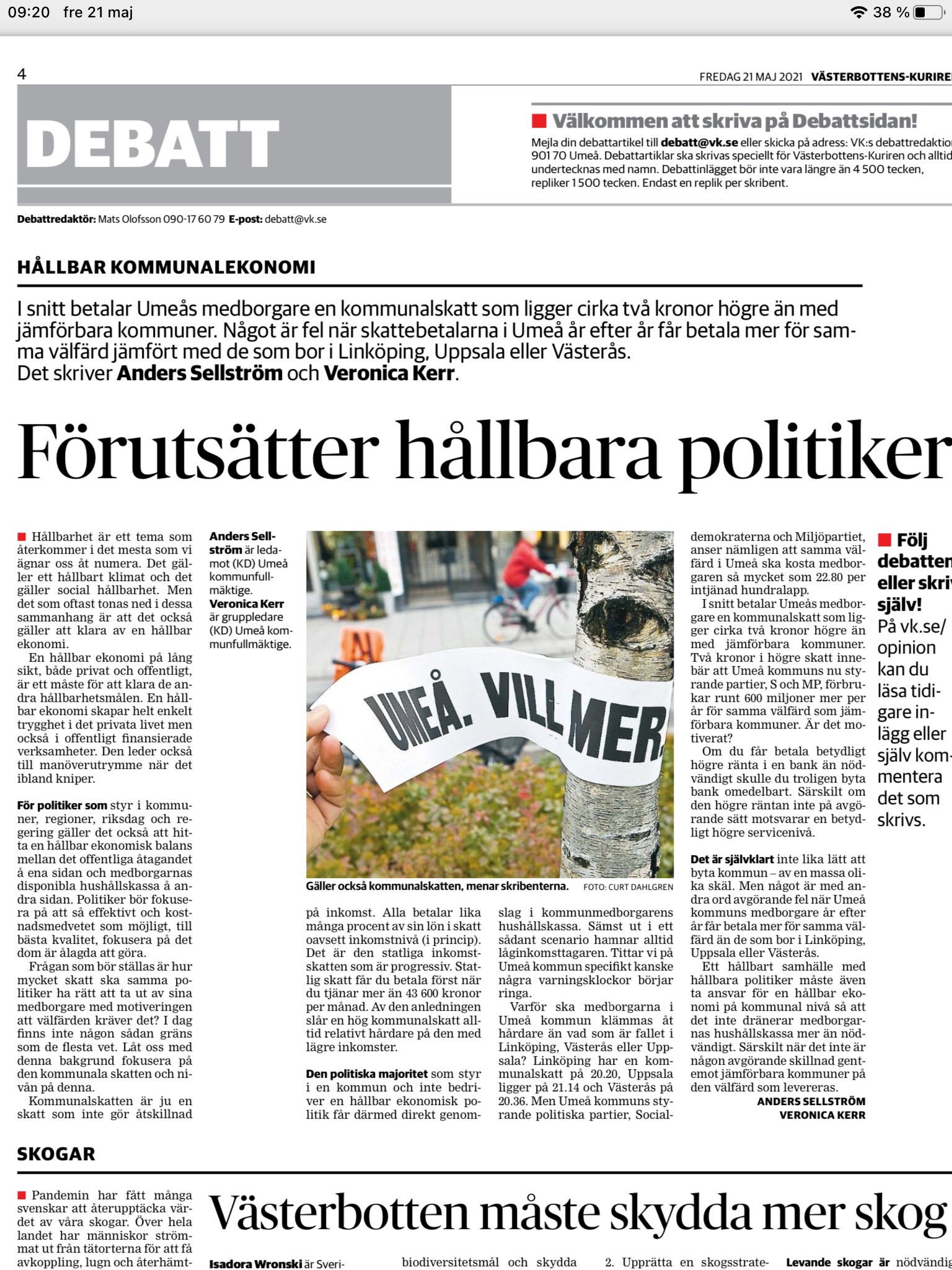 I dagens VK skriver jag och Anders Sellström om att hitta en hållbar ekonomisk balans mellan det offentliga åtagandet å ena sidan och medborgarnas disponibla hushållskassa å andra sidan. Frågan som fler borde ställa är hur mycket skatt ska politiker ha rätt att ta ut av sina medborgare med motiveringen att välfärden kräver det? Umeå kommuns nu styrande partier S och Mp förbrukar runt 600 miljoner kronor mer per år för samma välfärd, men är det motiverat?